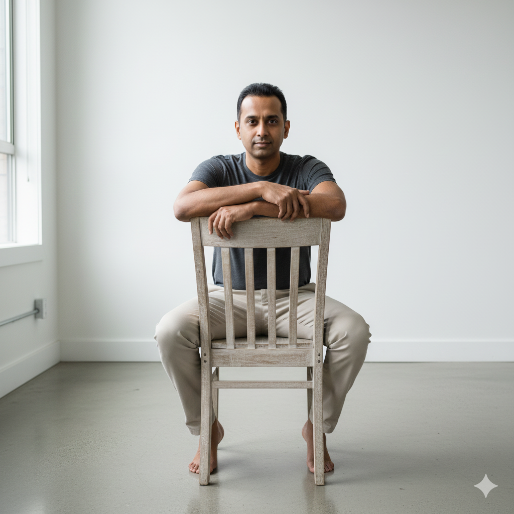 Ultra-realistic portrait of an Indian man sitting backward on a wooden chair, arms resting on the backrest, minimal white interior, soft natural studio lighting.