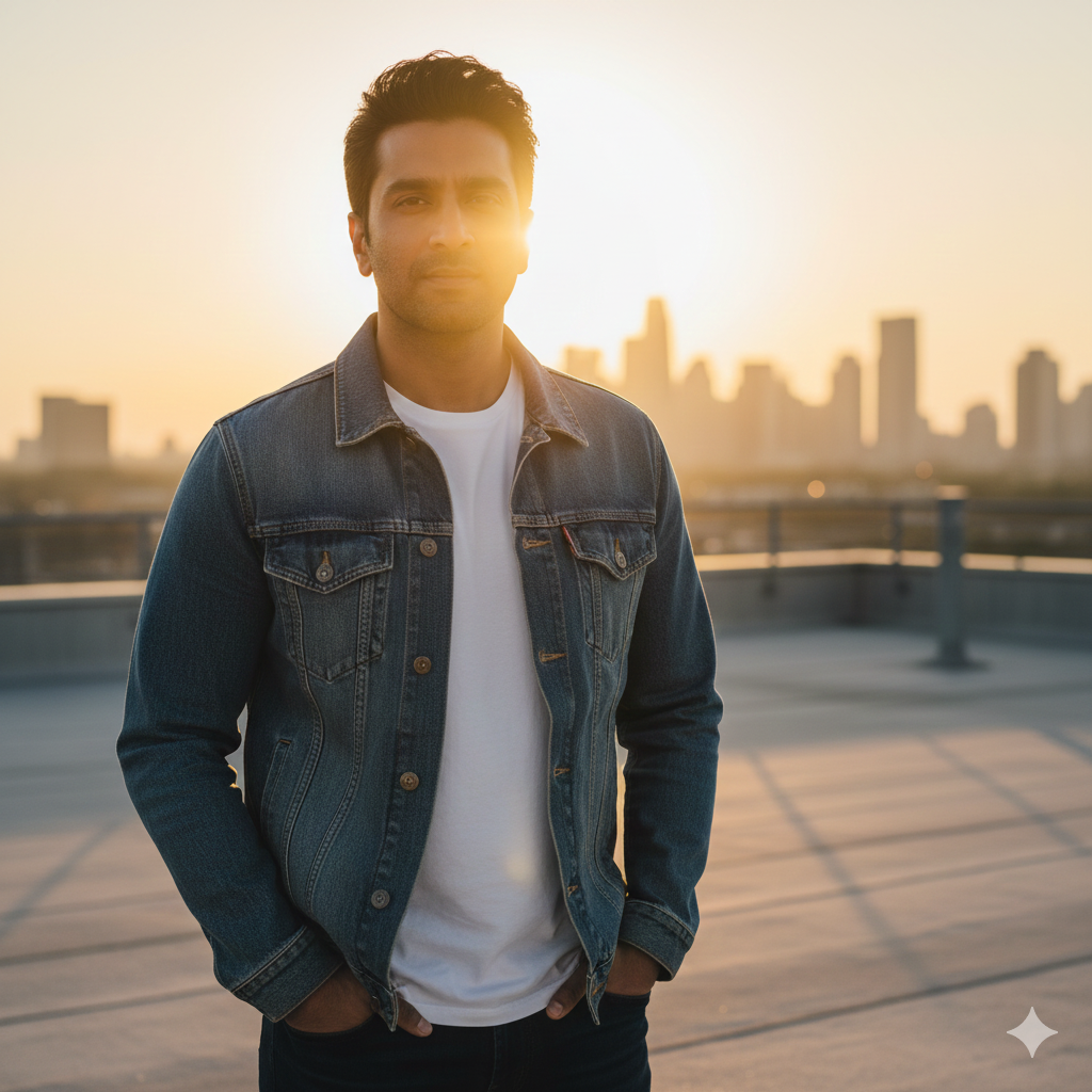 4K ultra-detailed portrait of an adult Indian man standing on a rooftop edge during golden hour, wearing a denim jacket and white tee, hands in pockets, warm sun flare behind him, cinematic shadows, ultra-sharp facial details.