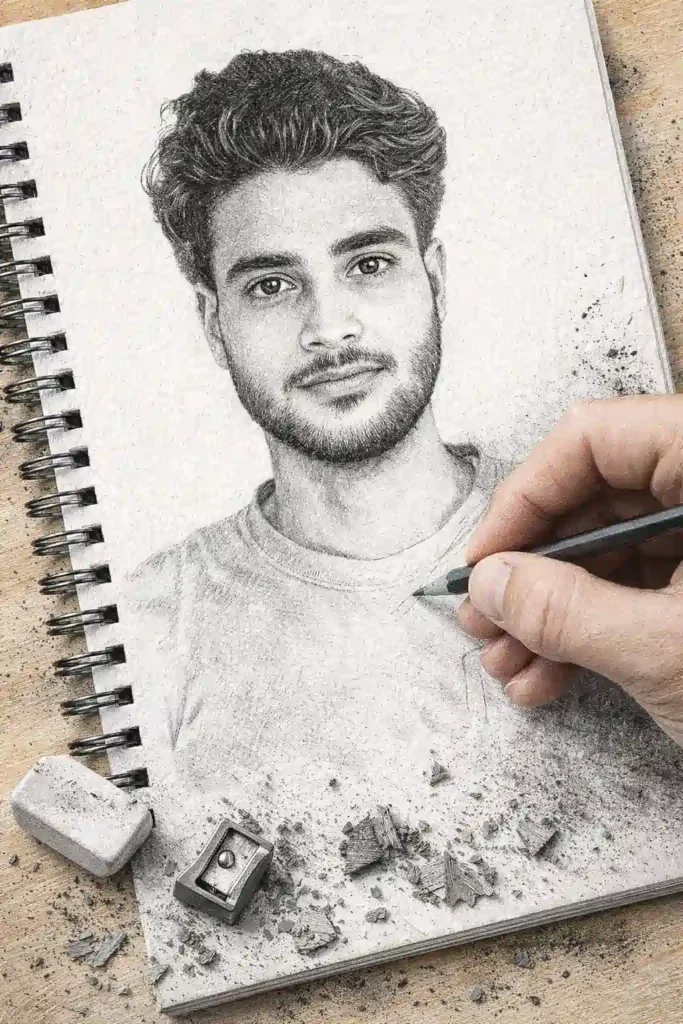 Generate an image from the uploaded photo that reimagines the subject as an ultra-detailed 3D graphite pencil sketch on textured white notebook paper. Emphasize crisp paper grain, subtle imperfections, and natural surface fibers. Show the subject actively drawing, with their hand holding a pencil as the sketch comes to life. Include an eraser, sharpener, and scattered pencil shavings resting on the page. Add realistic shadows, smudges, and fine graphite residue around the working area to reinforce the tactile, hand-drawn feel.