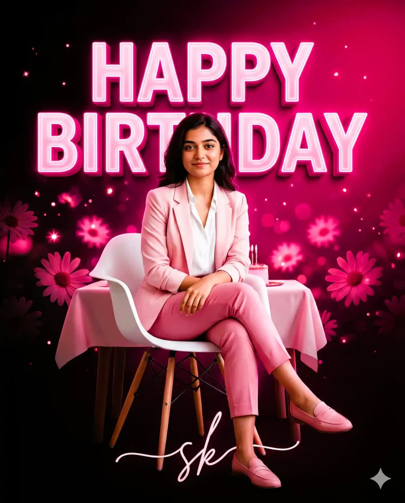 A dramatic dark-to-bright gradient backdrop with deep pink and black lighting, glowing floral bokeh, soft daisy silhouettes, and floating sparkles. Behind the subject, add large 3D glowing text saying HAPPY BIRTHDAY in bold pink neon style with strong backlight glow.