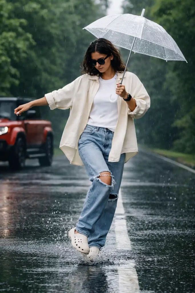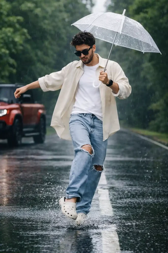 This prompt is designed to work across most advanced AI image tools. Keep lighting natural and avoid dramatic over-stylization. Let the rain do the visual work. Focus on motion, not perfection. Slight imperfections-uneven splashes, tilted umbrella, relaxed posture-make the output believable. If the image feels too polished, reduce sharpness and increase environmental blur slightly. The goal is realism with attitude, not a glossy studio shot.