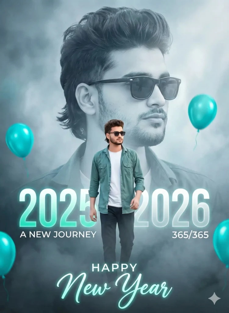 "A stylish, cinematic New Year's greeting photo manipulation. A young, cool-looking man with trendy hair (mullet-style) and sunglasses, wearing a teal/dusty green open button-down shirt. The composition is double-exposure style: a large, dominant portrait of the man in the background, with a smaller, full-body version of him layered in the foreground. Dominant text in a modern, bold font reads "2025" fading into "2026" with the subtitle "A NEW JOURNEY" and "365/365". At the bottom, stylized, glowing cursive text says "HAPPY New Year". The color palette is cool and desaturated, featuring teal/dusty green and a smoky, ethereal background of white and faded blue/grey. Several bright, teal helium balloons float around the frame, adding contrast. Cinematic lighting, high-detail photo, volumetric fog. no face chenge"