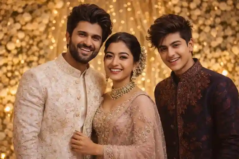 “Create a hyper-realistic wedding party scene featuring Vijay Deverakonda and Rashmika Mandanna standing together on a decorated wedding stage with golden floral backdrop and soft warm lights. Place the uploaded selfie person beside them as a close friend guest, wearing elegant Indian festive attire. Maintain natural skin tones and accurate facial features from the uploaded selfie. Use cinematic DSLR lighting, shallow depth of field, soft bokeh background, ultra-detailed 4K resolution, realistic shadows, candid celebration mood.”