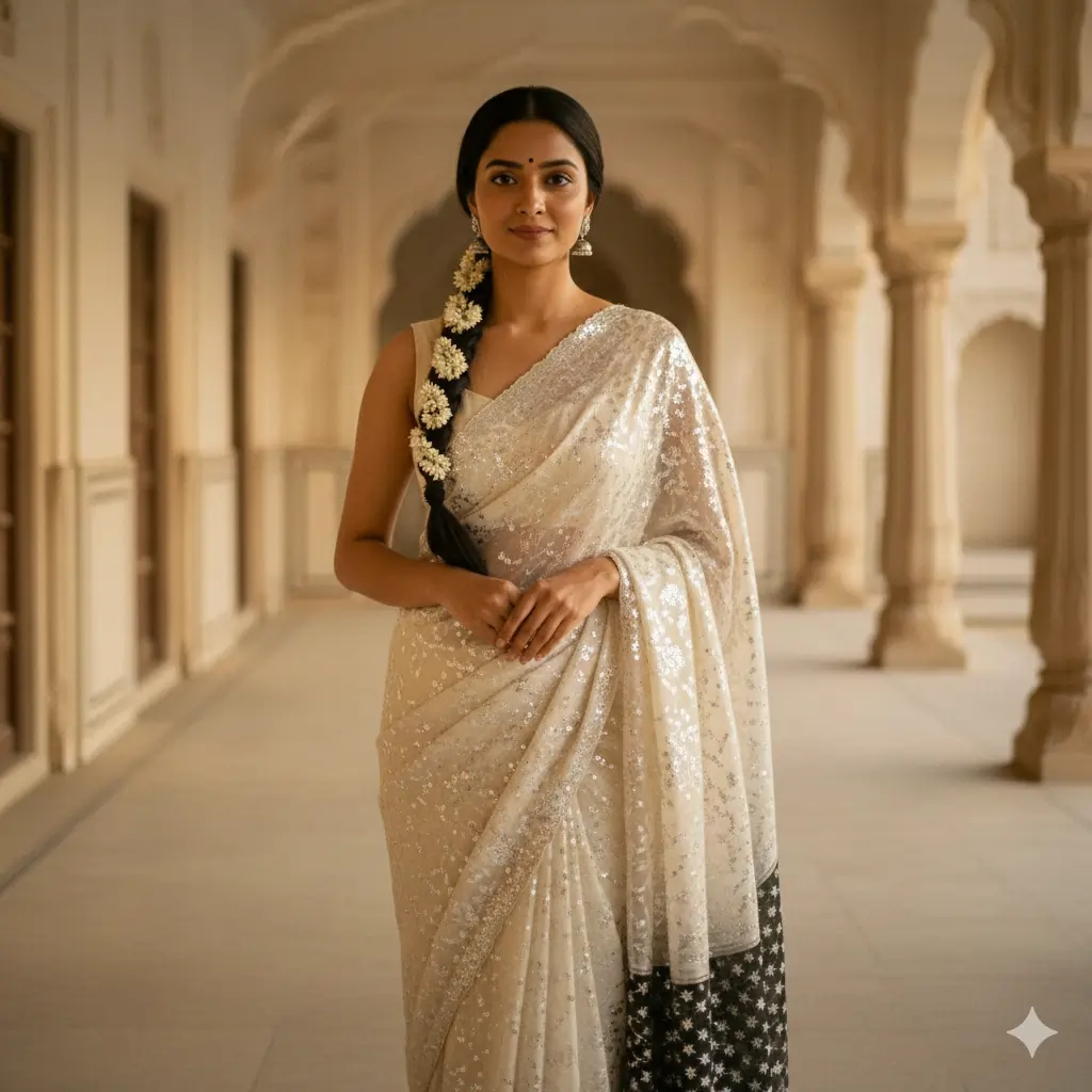 “Use the uploaded reference image as the PRIMARY visual guide and keep the same face and identity. Create a young Indian woman standing front-facing in a Mughal palace corridor wearing an ivory-white saree with dense silver sequin embroidery and a black pallu with small silver star motifs over the left shoulder. Matching embroidered blouse, long braid with jasmine gajra, small black bindi, silver jhumka earrings, no necklace or bangles. Calm expression, hands clasped, soft cinematic warm light, 85mm lens, shallow depth, ultra-realistic 4K, no stylization or art effects. Negative: face change, modern dress, heavy makeup, blur, artifacts.”